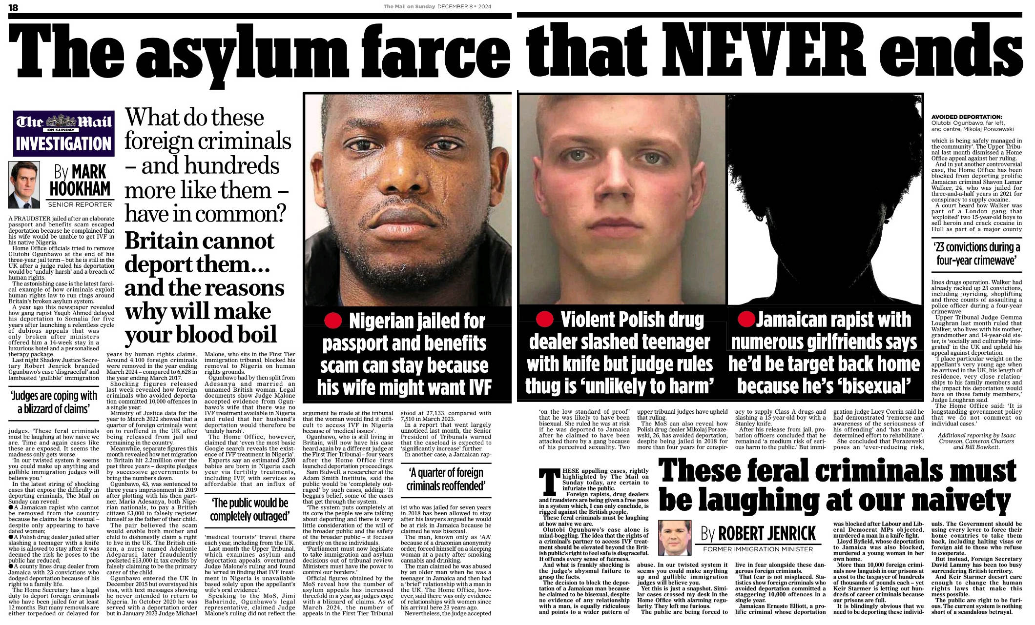 She stated that she expected that the number of prisoners to be released in September 2024 would be "in the low thousands", with further releases over the following 18 months with updates in parliament every three months. This included 37 who were not eligible for early release. At least one is suspected to have gone on to offend again. Following the 2024 United Kingdom riots, Mahmood pledged that "the full force of the law [would] be brought against" the rioters (mostly white working class people angered by the child killings of alledged Islamic "ricin" terrorist Axel Rudakubana), and those inciting them. She also remarked that the volume of cases relating to the riots would affect the UK's justice system for years. In an article for the Mail former Immigration Minister Robert Jenrick stated "Foreign rapists, drug dealers and fraudsters are being given a free pass in a system which, I can only conclude, is rigged against the British people". Statistics show foreign criminals who avoided deportation committed a staggering 10,000 offences in a single year.